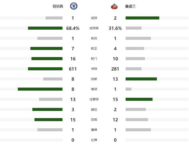 不过第22分钟,桑德兰就扳平了比分,大力边线球掷出后,造成了切尔西门前一片混乱,伊西多捅射建功,将比分追至1-1平,第39分钟切尔西左侧角球开出,后点无人盯防的加纳乔直接凌空扫射,但被客队门将神勇扑出,半场比赛结束之前,查洛巴完成了一脚势大力沉的远射,又被桑德兰门将托出了横梁。